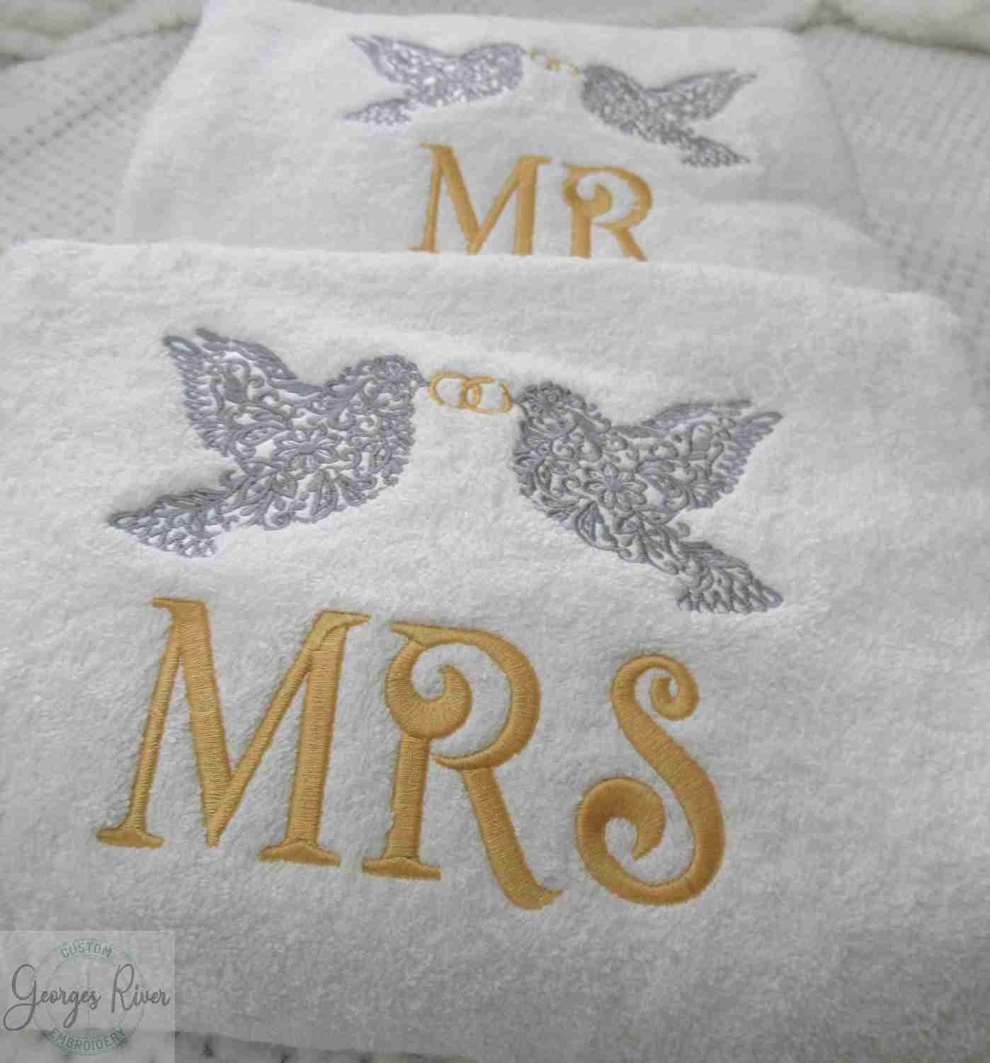 Personalised Monogrammed Wedding Anniversary Gift Towel Set Mr & Mrs Doves Design
